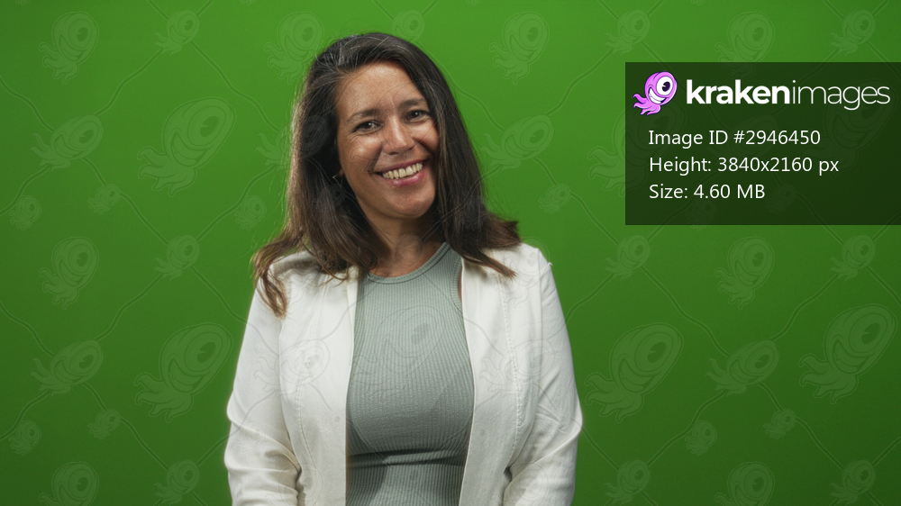 Woman smiling with visible face and relaxed hands posed against green screen studio backdrop; friendly confidence.
