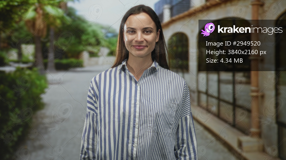 Woman smiling with visible face and striped shirt standing on a cobblestone street beside arched building windows and leafy hedges; serenity.