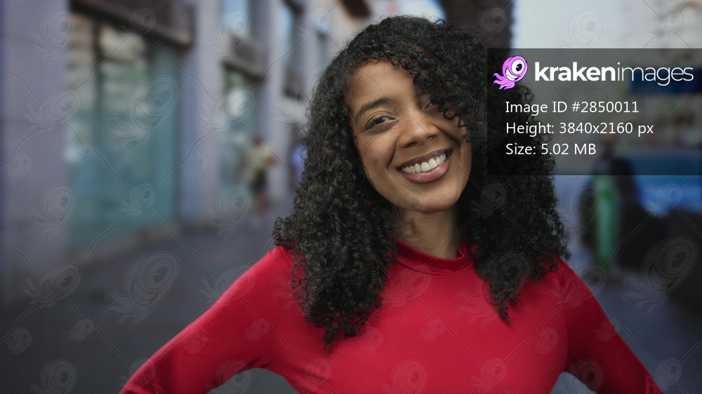 Woman smiling with visible teeth and curly hair on busy city street with hands on hips; confidence.