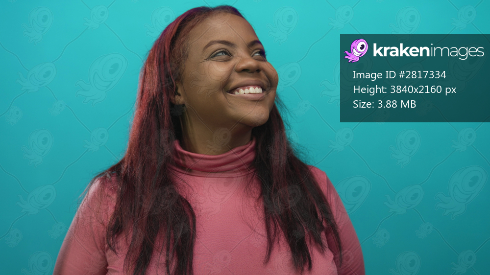 Woman smiling with visible teeth in pink turtleneck in studio with teal background; optimism future confidence.