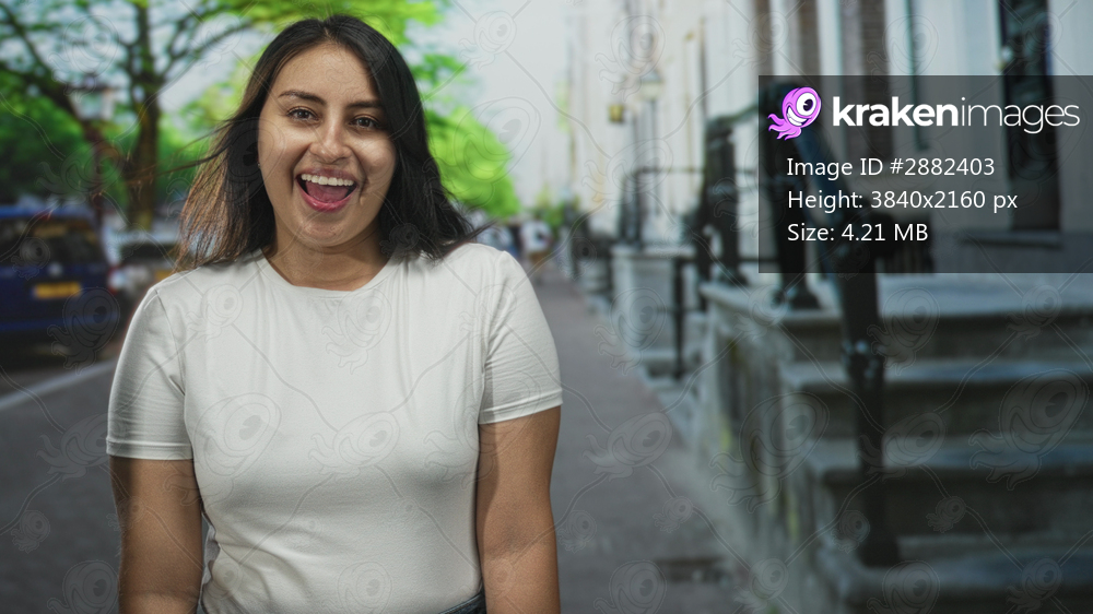 Woman smiling with visible teeth in white t shirt on a leafy city street beside parked cars and stone steps by row houses; happiness.
