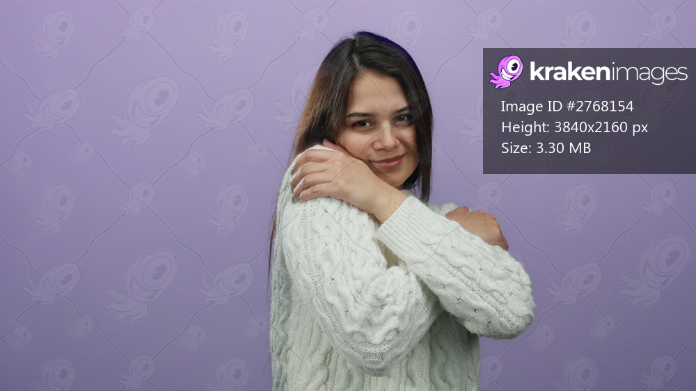 Woman smiling warmly in cozy white sweater embracing herself against vibrant purple backdrop enhancing feelings of warmth and comfort.