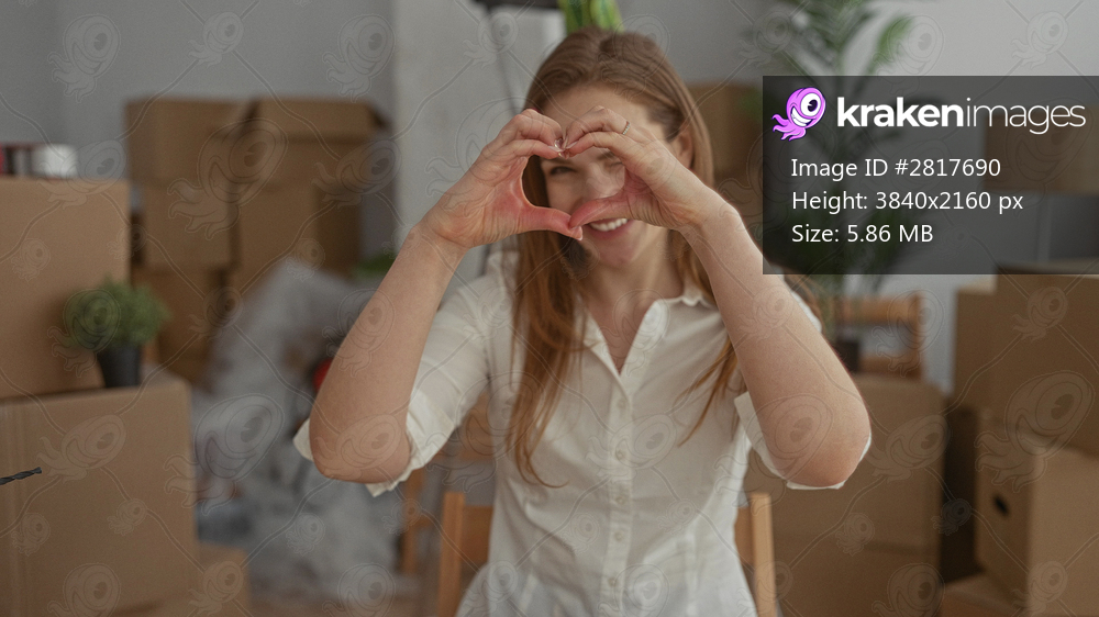 Woman smiling warmly makes heart shape with hands in new building filled with cardboard boxes; affection.