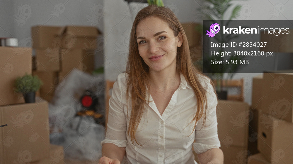 Woman smiling warmly makes heart shape with hands in new building filled with cardboard boxes; affection.