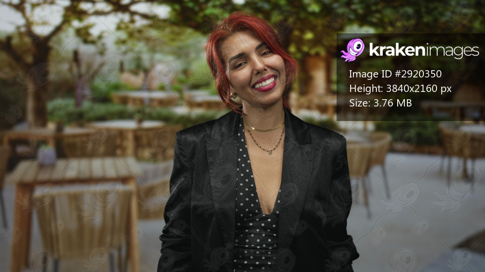 Woman smiling warmly with visible cleavage and polka dot dress at restaurant terrace outdoors; confidence.