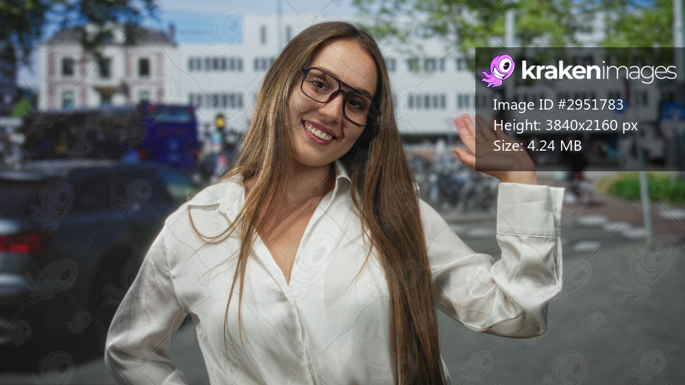 Woman smiling and waving hand on a busy street in front of shops and cars, wearing glasses and white blouse; friendly greeting.