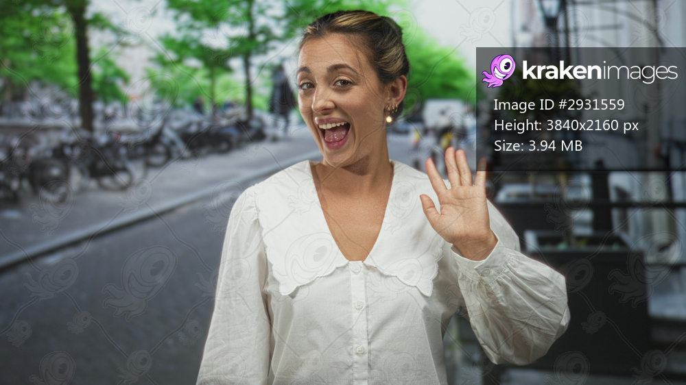 Woman smiling and waving hand on city street beside parked bicycles and trees, wearing white blouse and gold earrings; friendly greeting.