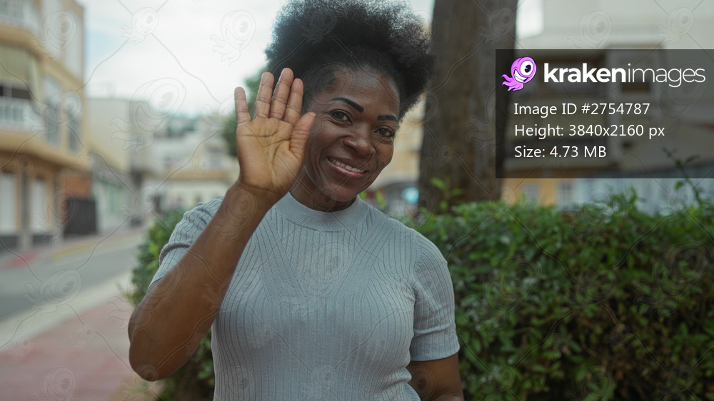 Woman smiling and waving on city street outdoors, showcasing friendly gesture in urban environment.