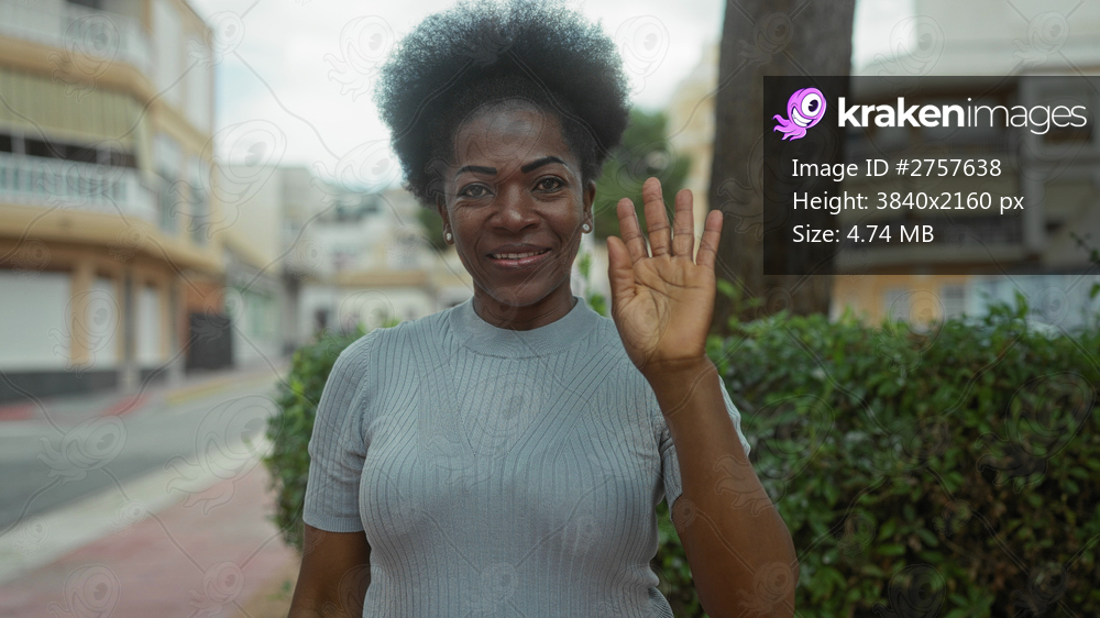 Woman smiling and waving on city street outdoors, showcasing friendly gesture in urban environment.
