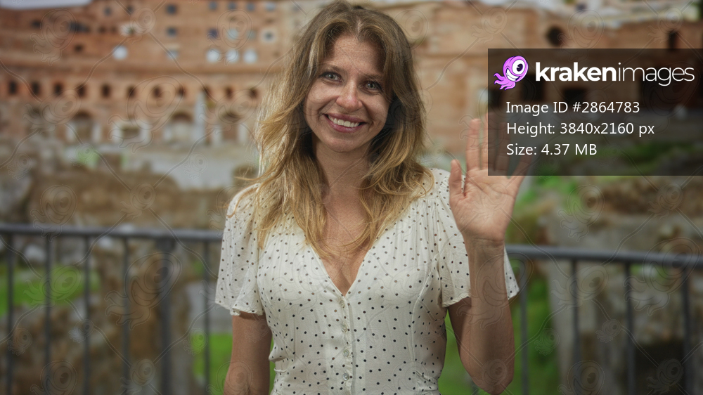 Woman smiling and waving right hand at roman ruins building with railing in foreground, casual dress and sunlight; greeting warmth.