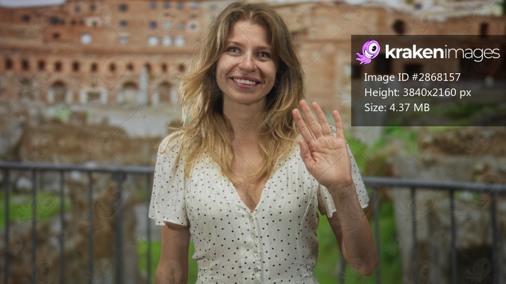 Woman smiling and waving right hand at roman ruins building with railing in foreground, casual dress and sunlight; greeting warmth.