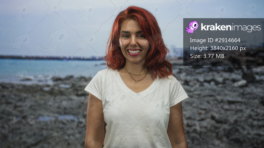 Woman smiling wearing a white t shirt and layered necklaces on a rocky coast by the sea; coastal joy vacation.