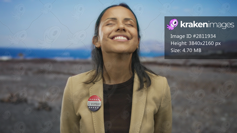 Woman smiling wearing badge on beach with a clear blue sky background in the united states.