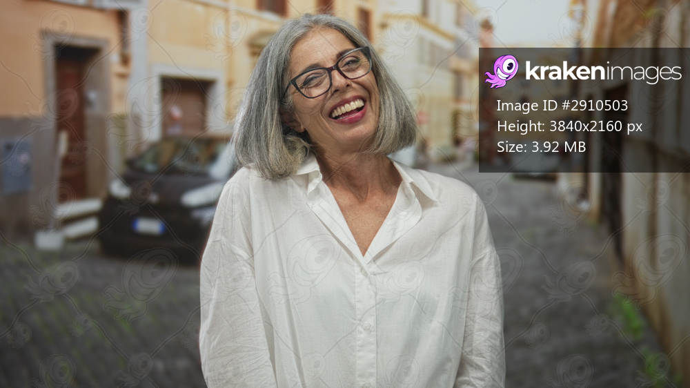 Woman smiling wearing glasses and a white shirt, standing on a narrow cobbled street with parked cars and old city buildings; contentment resilience acceptance. - Kraken Images