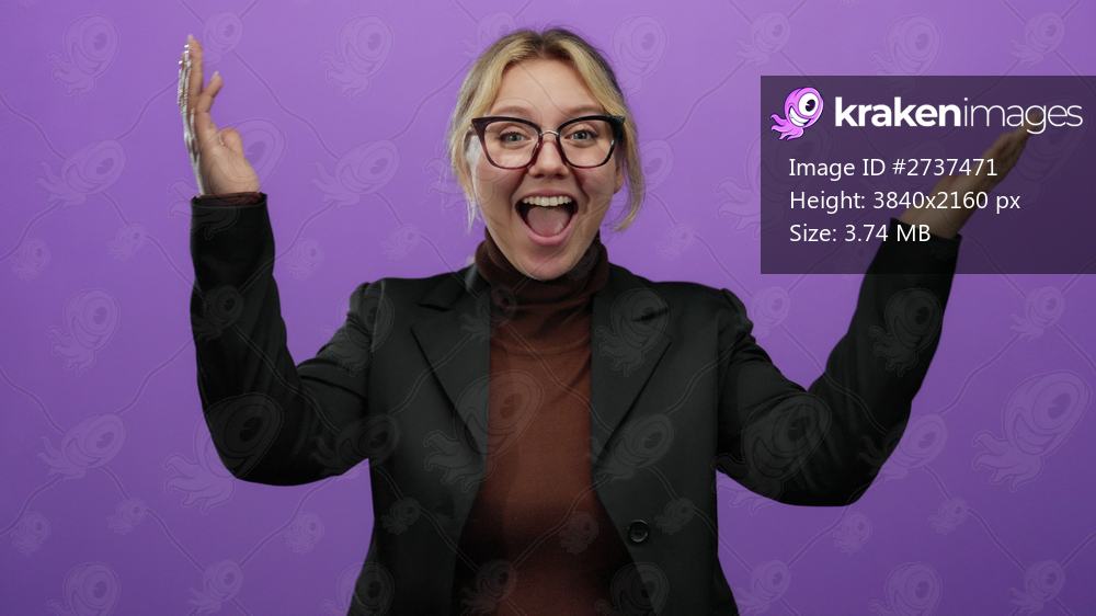 Woman smiling wearing glasses and black blazer makes binocular hands with excitement against vibrant purple background showing blonde hair and joyful expression. - Kraken Images