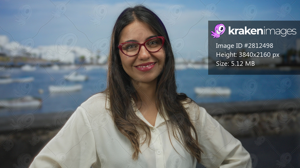 Woman smiling wearing glasses by the seaside with boats in the background showcasing a relaxed outdoor setting with a clear blue sky.