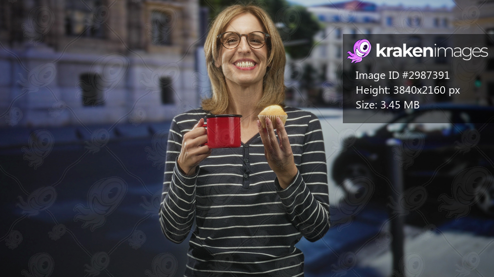 Woman smiling wearing glasses holds red mug in right hand and muffin in left hand on a cobblestone street near parked car; morning comfort joy.