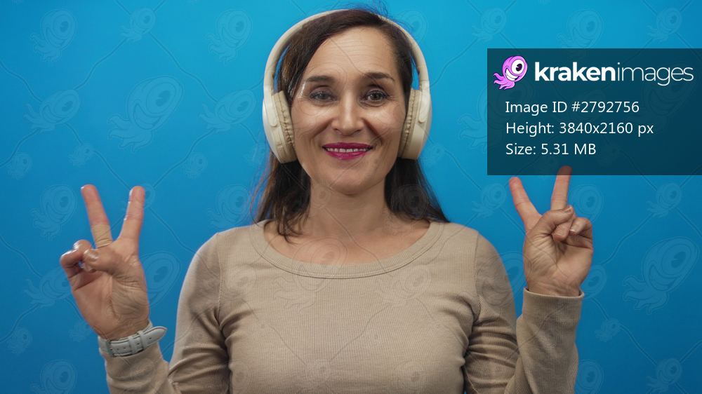 Woman smiling wearing headphones making peace signs against a vibrant blue background highlights happiness and youthful energy