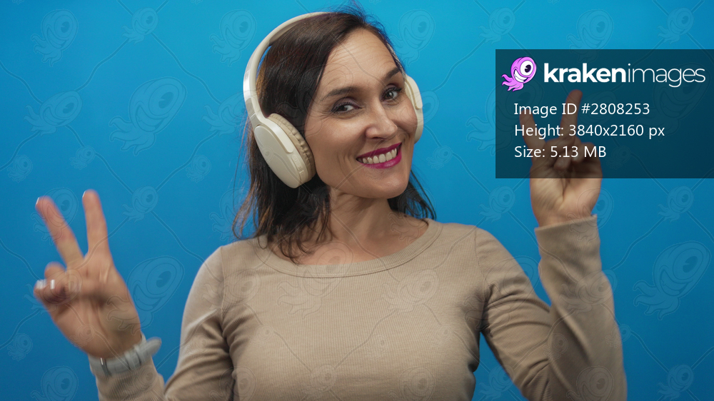 Woman smiling wearing headphones making peace signs against a vibrant blue background highlights happiness and youthful energy