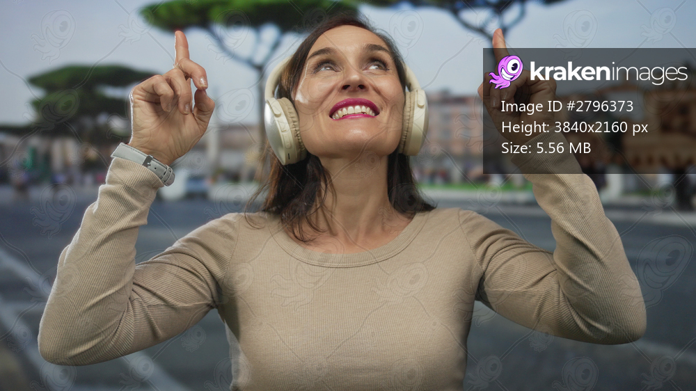 Woman smiling wearing headphones pointing up on a vibrant urban street, showcasing a lively outdoor atmosphere surrounded by blurred cityscape and unique trees. - Kraken Images