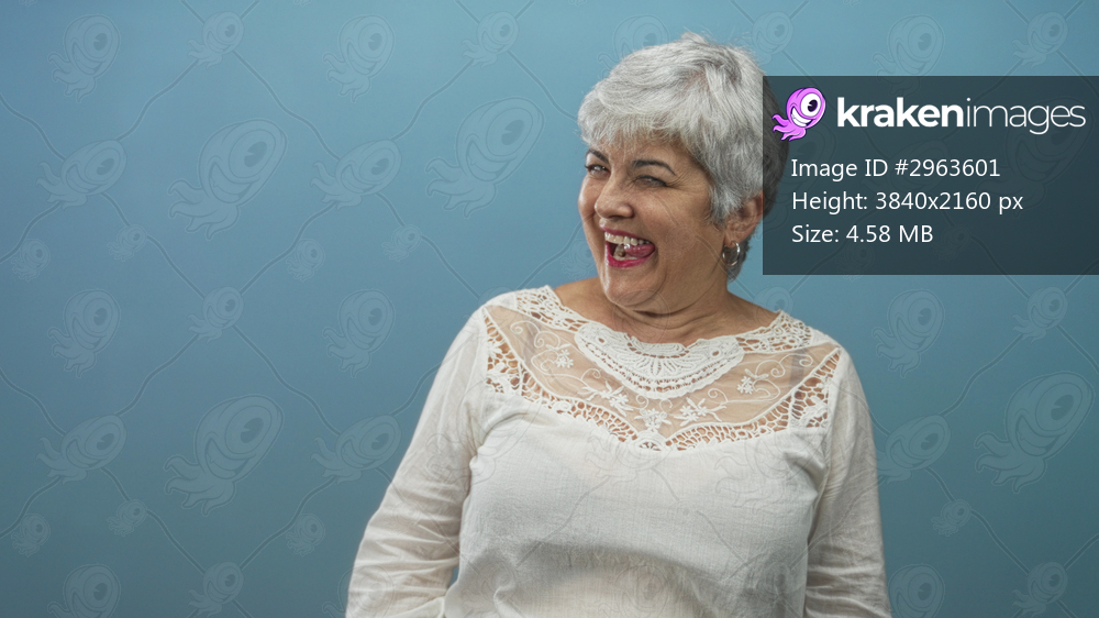 Woman smiling wearing lace top and hoop earrings standing in studio with slight head tilt; joy confidence warmth.