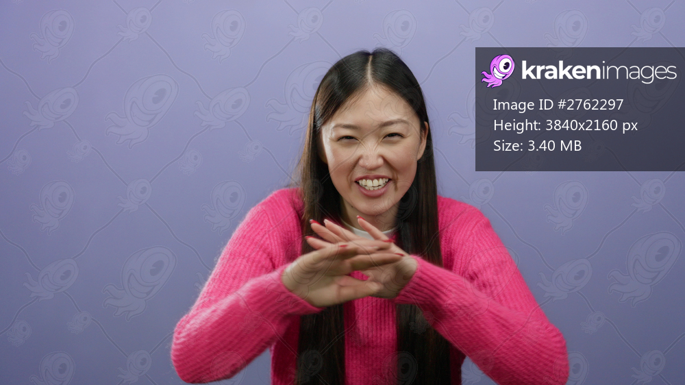Woman smiling wearing pink sweater in front of purple background with hands gesturing, embodying joy and expression.