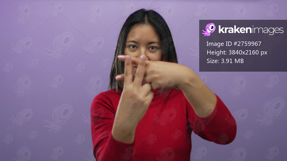 Woman smiling wearing red sweater making hashtag gesture against isolated purple background suggesting social media communication