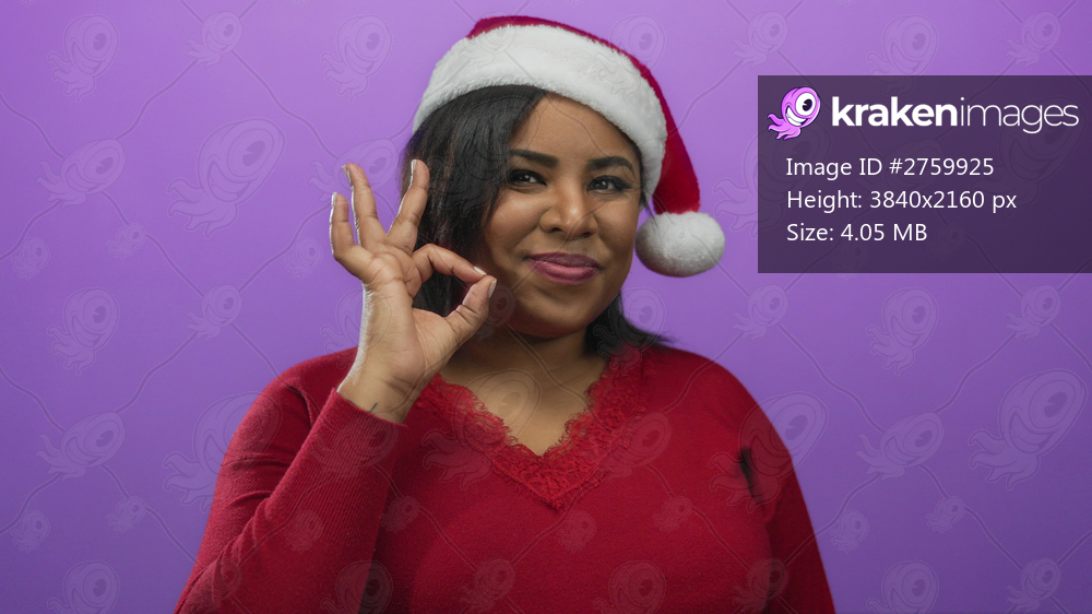 Woman smiling wearing santa hat red sweater on purple background making ok hand gesture expressing positivity holiday spirit festive mood.