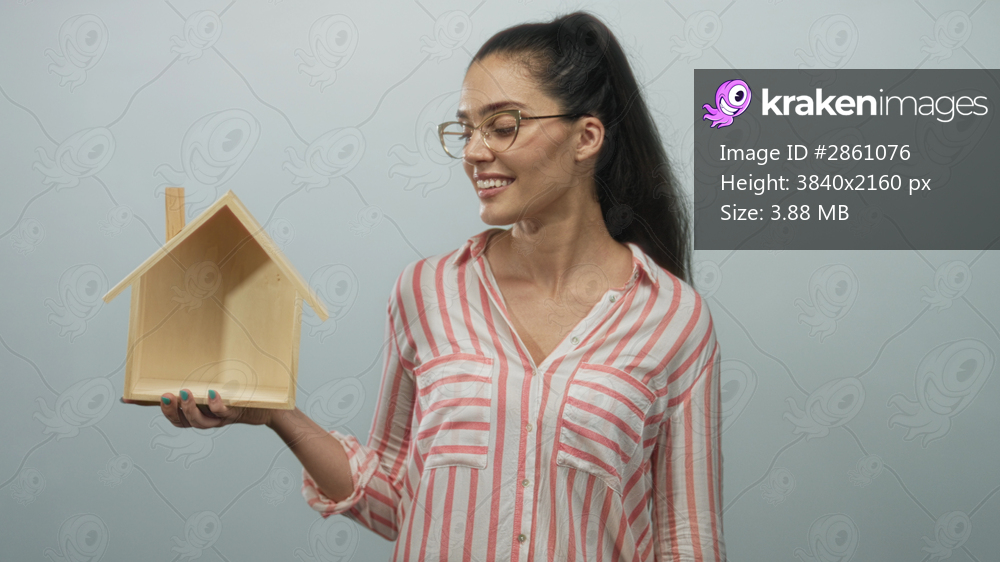 Woman smiling wearing striped shirt and glasses while holding wooden house model in studio; stability confidence.