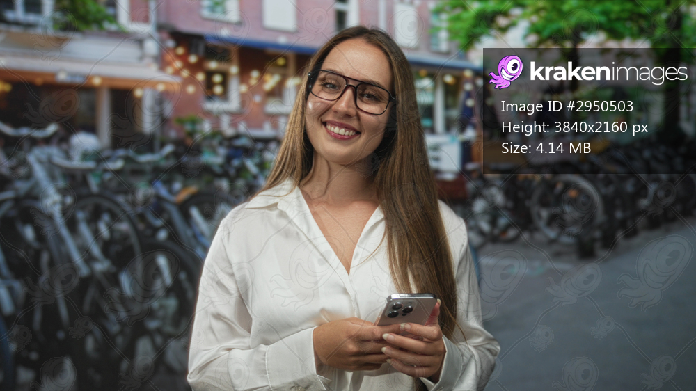 Woman smiling, wearing white blouse and glasses, holding smartphone with hands on street in amsterdam; urban ease contentment.