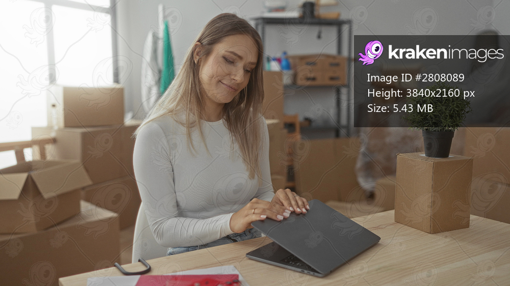 Woman smiling while closing laptop in cozy living room surrounded by moving boxes, reflecting a cheerful and modern interior setting.