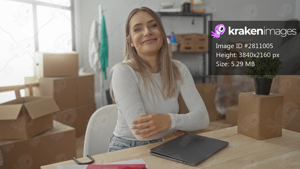 Woman smiling while closing laptop in cozy living room surrounded by moving boxes, reflecting a cheerful and modern interior setting.