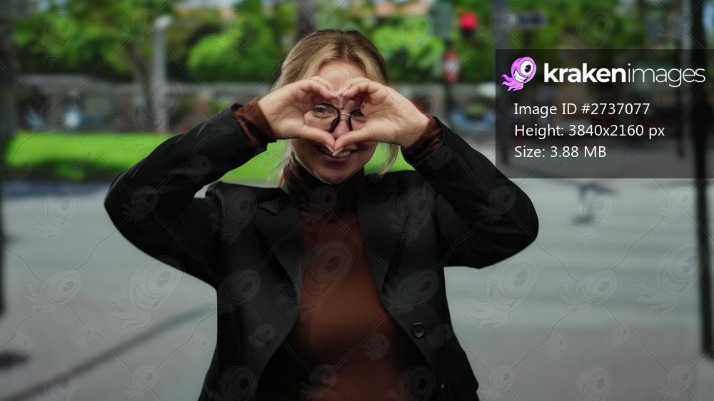 Woman smiling while forming heart with hands in urban city street, wearing glasses and blazer outdoors, expressing joy and connection, caucasian and cheerful. - Kraken Images