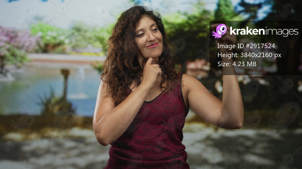 Woman smiling while holding a cherry in right hand and touching chin with left hand in park with green trees; serenity contemplation.