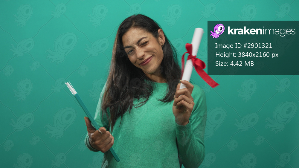 Woman smiling while holding a diploma and teal book in studio with hands visible and tilted head; graduation pride accomplishment.