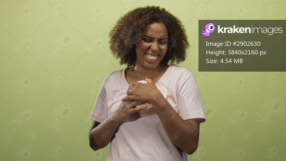 Woman smiling while holding a heart shaped gift box to her chest in green studio; joy gratitude warmth.