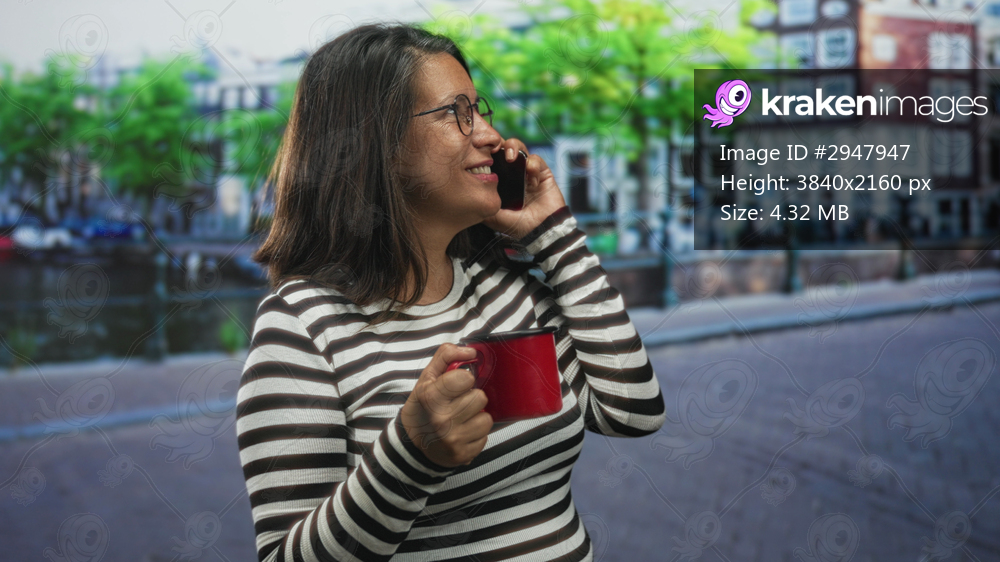Woman smiling while holding a red mug and phone to ear on street by a canal and buildings, wearing striped top and glasses; happiness connection.