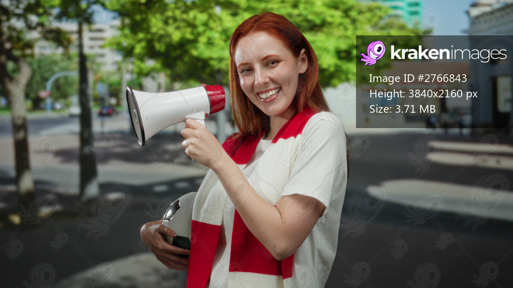 Woman smiling while holding a soccer ball and megaphone on a city street, showcasing vibrant urban outdoor enthusiasm and fan support.