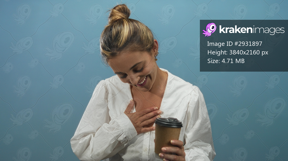 Woman smiling while holding a takeaway coffee cup and touching her chest with one hand in blue studio set; gratitude.