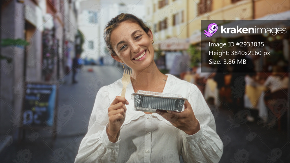 Woman smiling while holding a wooden fork and foil food container on a street terrace outside a busy restaurant; happiness sharing local dining.