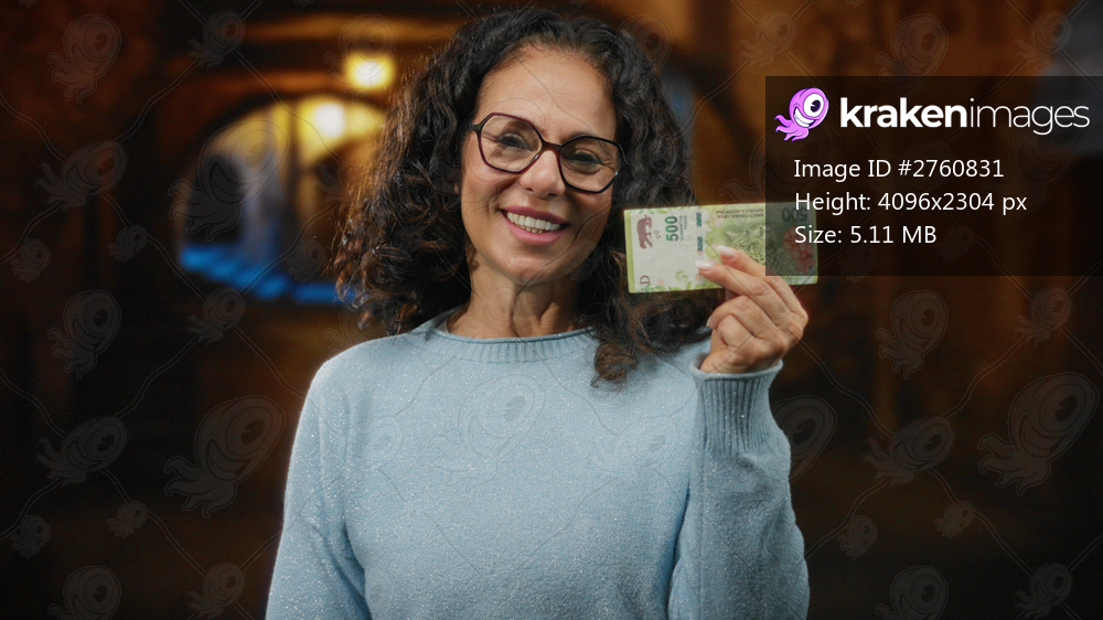 Woman smiling while holding argentine pesos on a city street, showcasing financial themes with a vibrant backdrop.