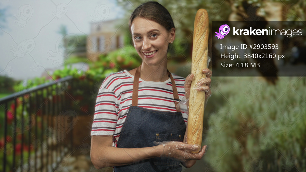 Woman smiling while holding baguette with gloved hands on street outside building wearing apron; friendly bakery service.