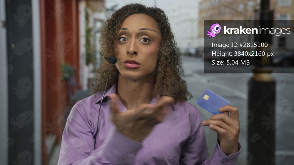 Woman smiling while holding blue creditcard adjusts headset microphone on city street; financial empowerment.