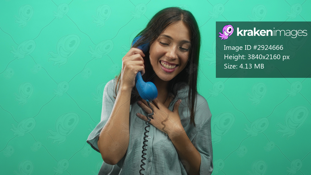 Woman smiling while holding blue telephone handset to chest in turquoise studio; joy gratitude connection.