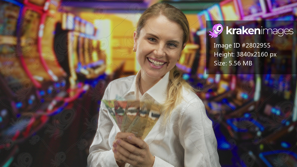 Woman smiling while holding canadian dollars near slot machines in a lively casino setting, showcasing a sense of excitement and success indoors.