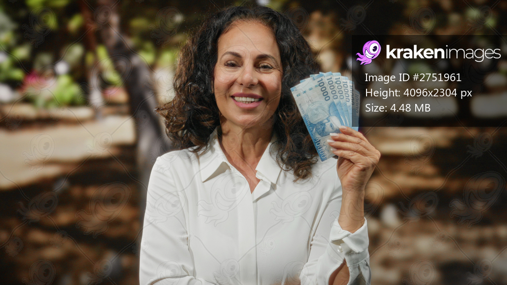 Woman smiling while holding chilean pesos in a park, showcasing currency with a joyful expression outdoors.