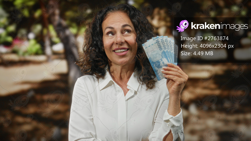 Woman smiling while holding chilean pesos in a park, showcasing currency with a joyful expression outdoors.