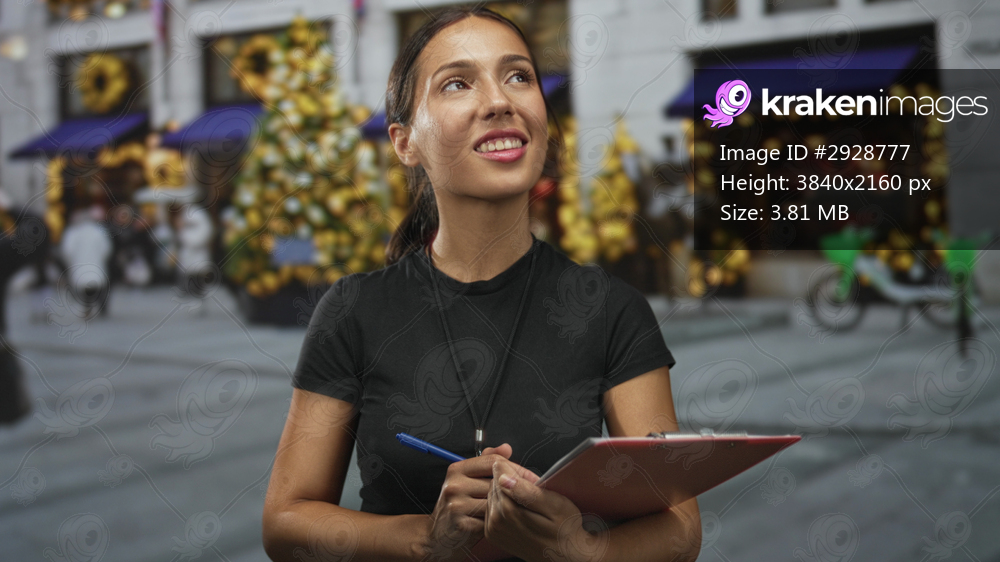 Woman smiling while holding clipboard and pen on a busy street with christmas decorations; holiday season planning hopeful.