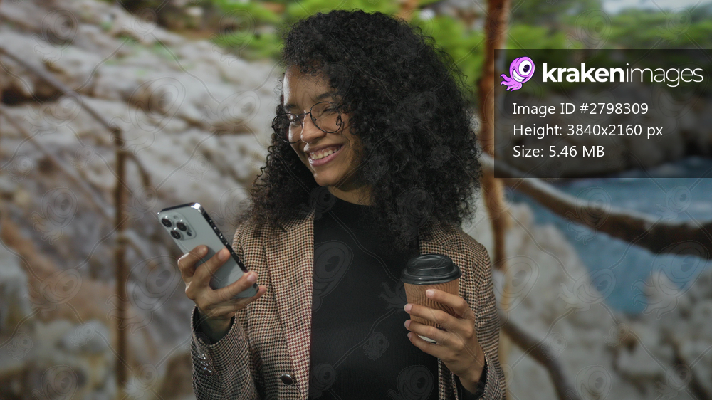 Woman smiling while holding coffee and smartphone outdoors in rocky scenic area under sunny sky