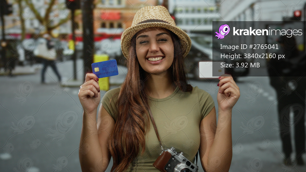 Woman smiling while holding credit cards on bustling street with hat, brown hair, clothing, young, hispanic, urban, daylight, cars, background.